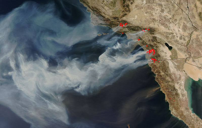 This NASA image (hi-res version) shows the smoke from the California wildfires on October 7, 2007. To learn more, visit NASA Images of California Wildfires. The fires result from the combination of extreme drought and the seasonal Santa Ana winds. See NASA's Earth Observatory for images of similar fires four years earlier.